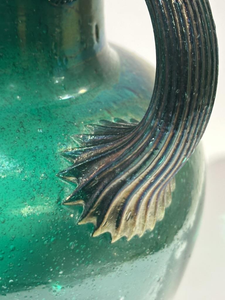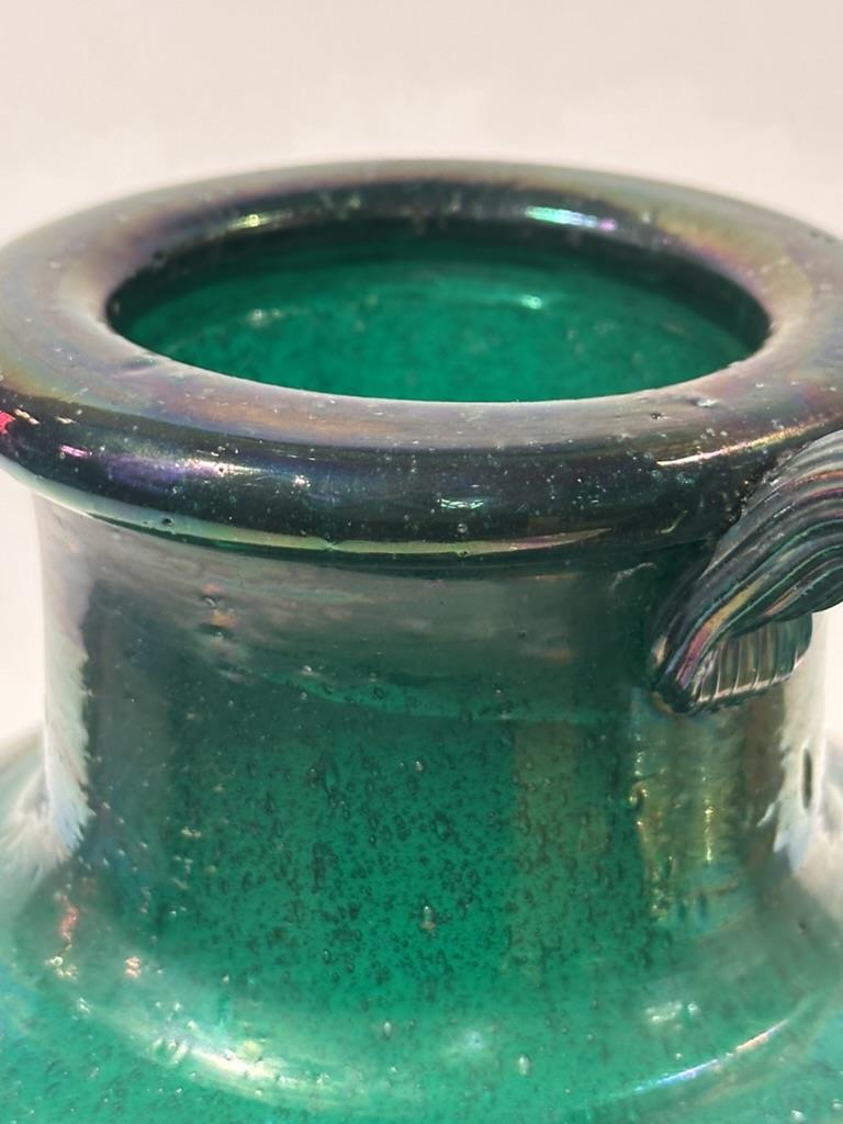 Vaso ad anfora in vetro pulegoso verde, con ansa applicata e superficie fortemente iridata.