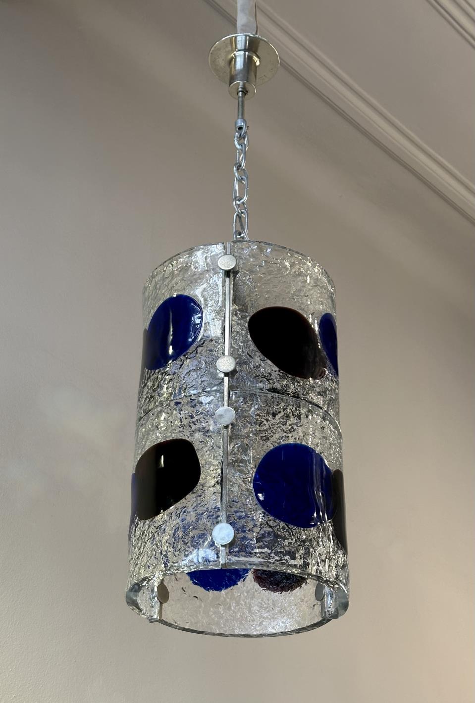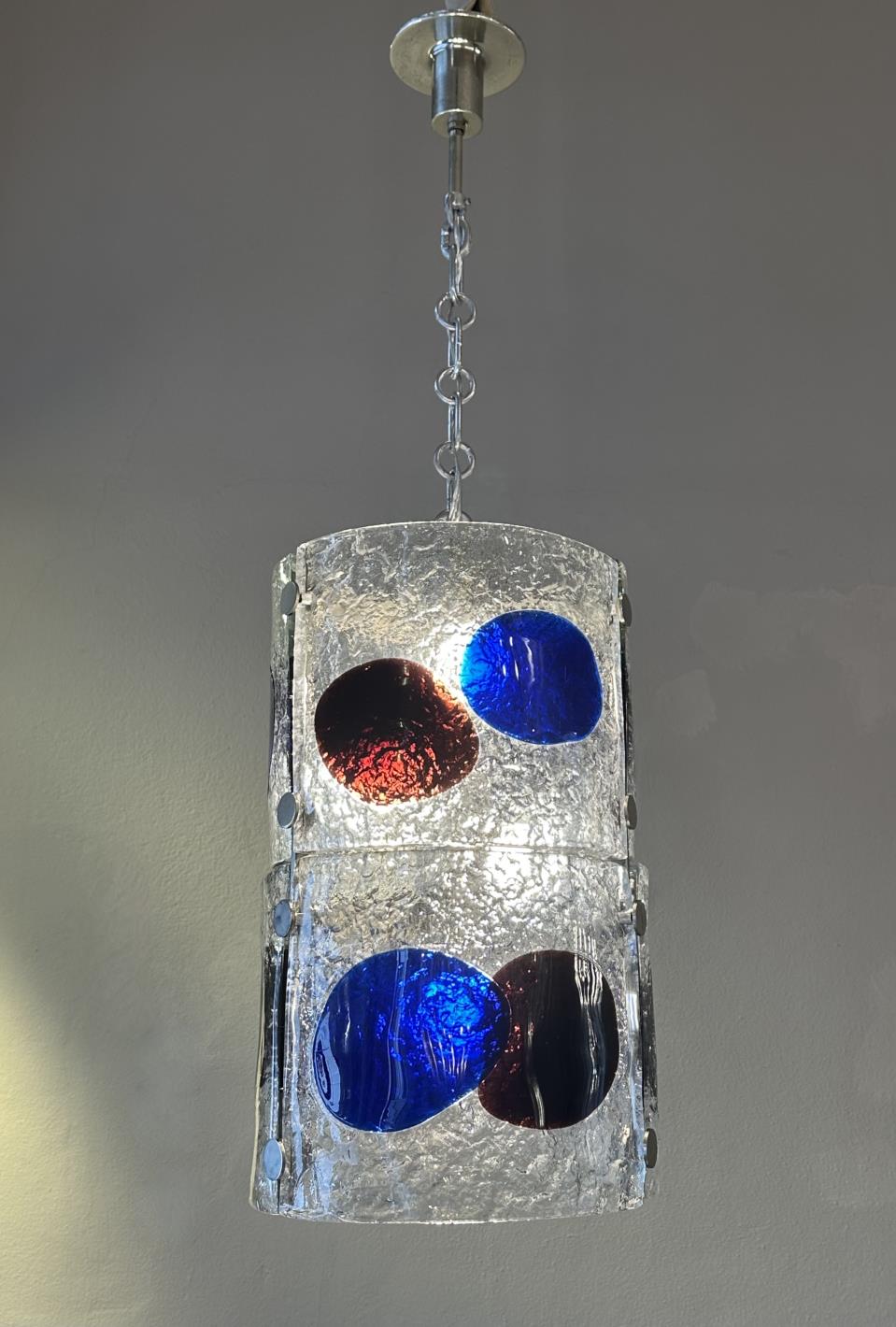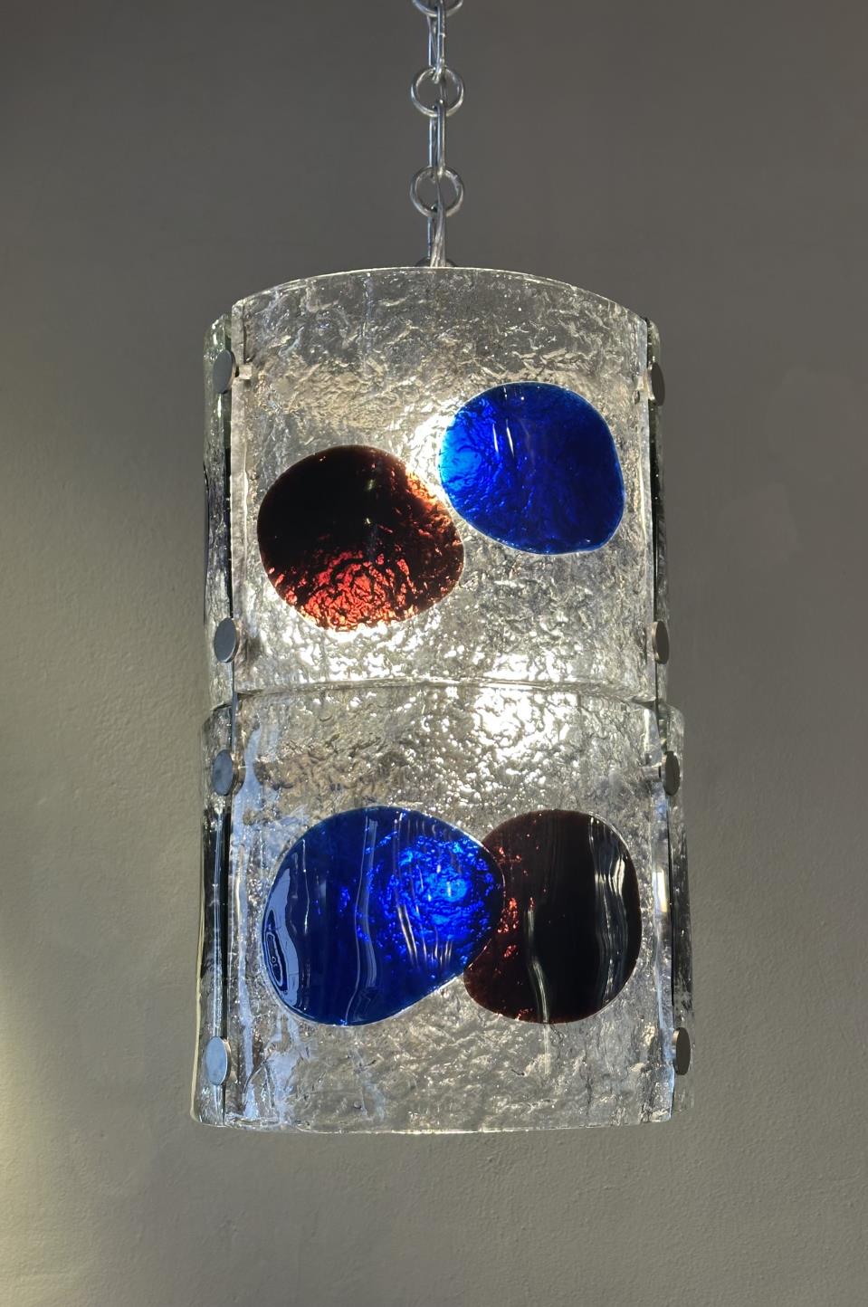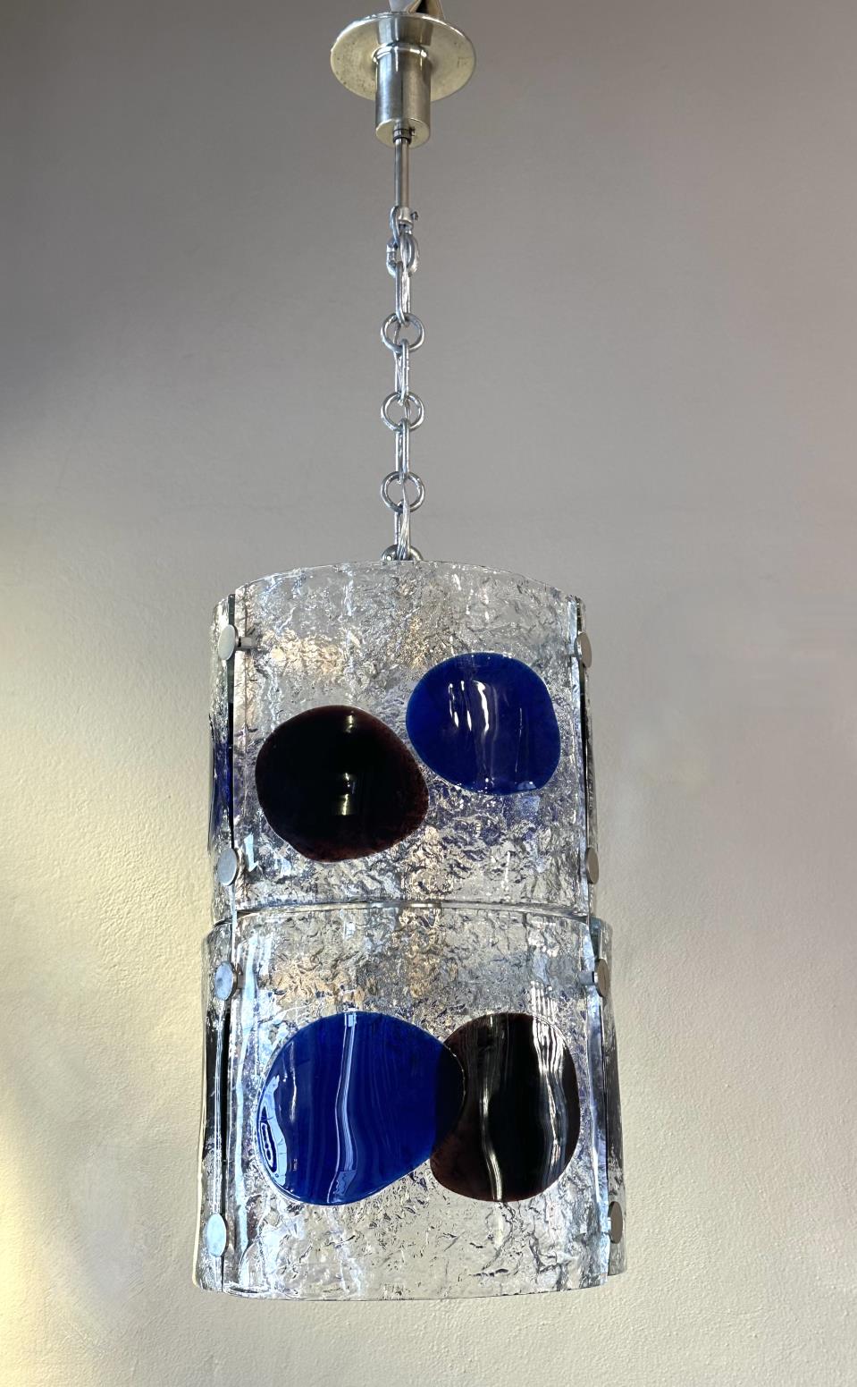 Lampada a sospensione della serie Cheerio con pannelli curvi, esterno lucidato a fuoco, interno grezzo in vetro trasparente con macchie blu e viola scuro. Struttura in metallo cromato.